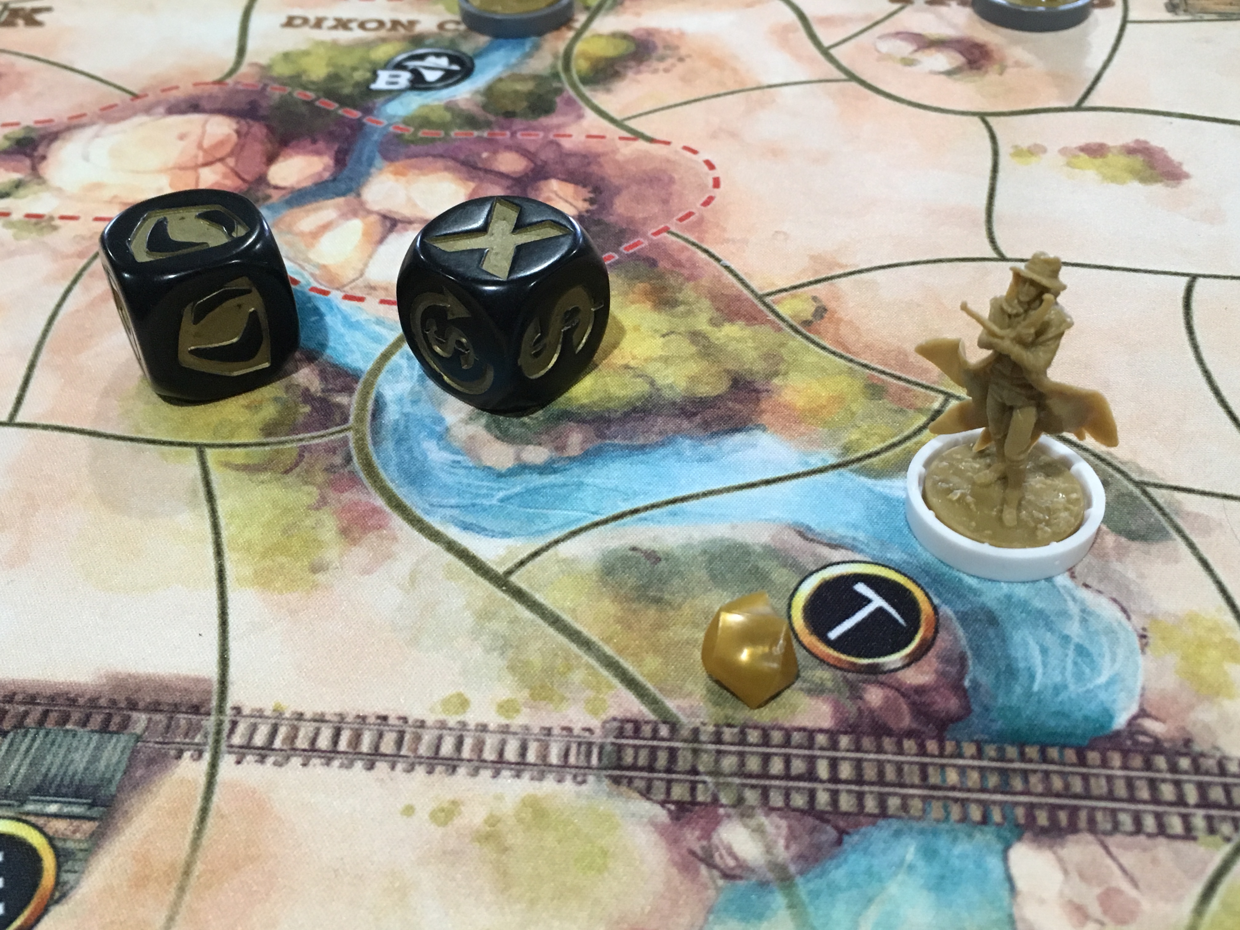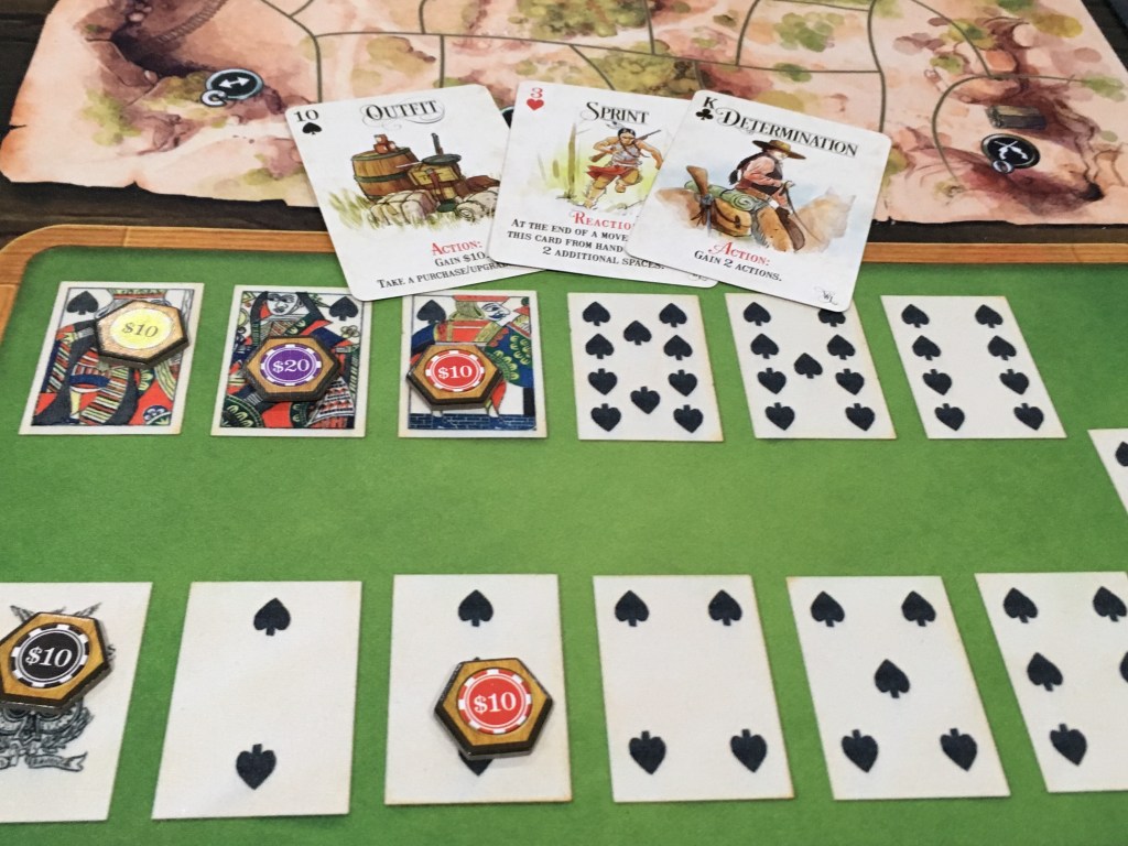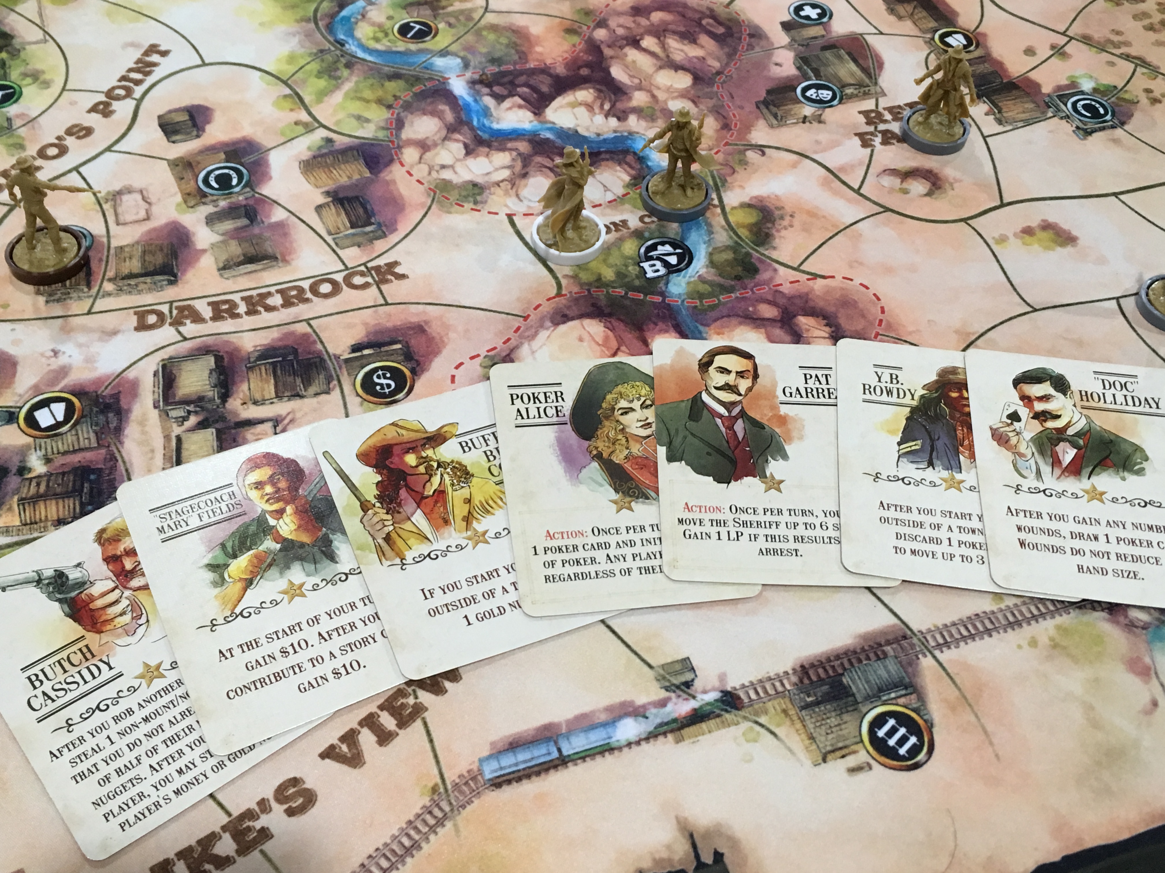 Rather than go over the rules…which there are a dozen youtube videos telling you how to play Western Legends, lets just look at our latest game to give readers some examples of the great fun that is to be had here. The game is filled with a ton of characters to play with, and we chose Stagecoach Mary Fields, Buffalo Bill Cody, Marshall Pat Garrett and Poker Alice. We decided to play the long game to give us more time to get into the groove. We also chose to add the Man In Black to give us a little more pressure to push our pace. The game began with Pat and Poker Alice out in the frontier, while Bill Cody and Mary were over in the original territories.
