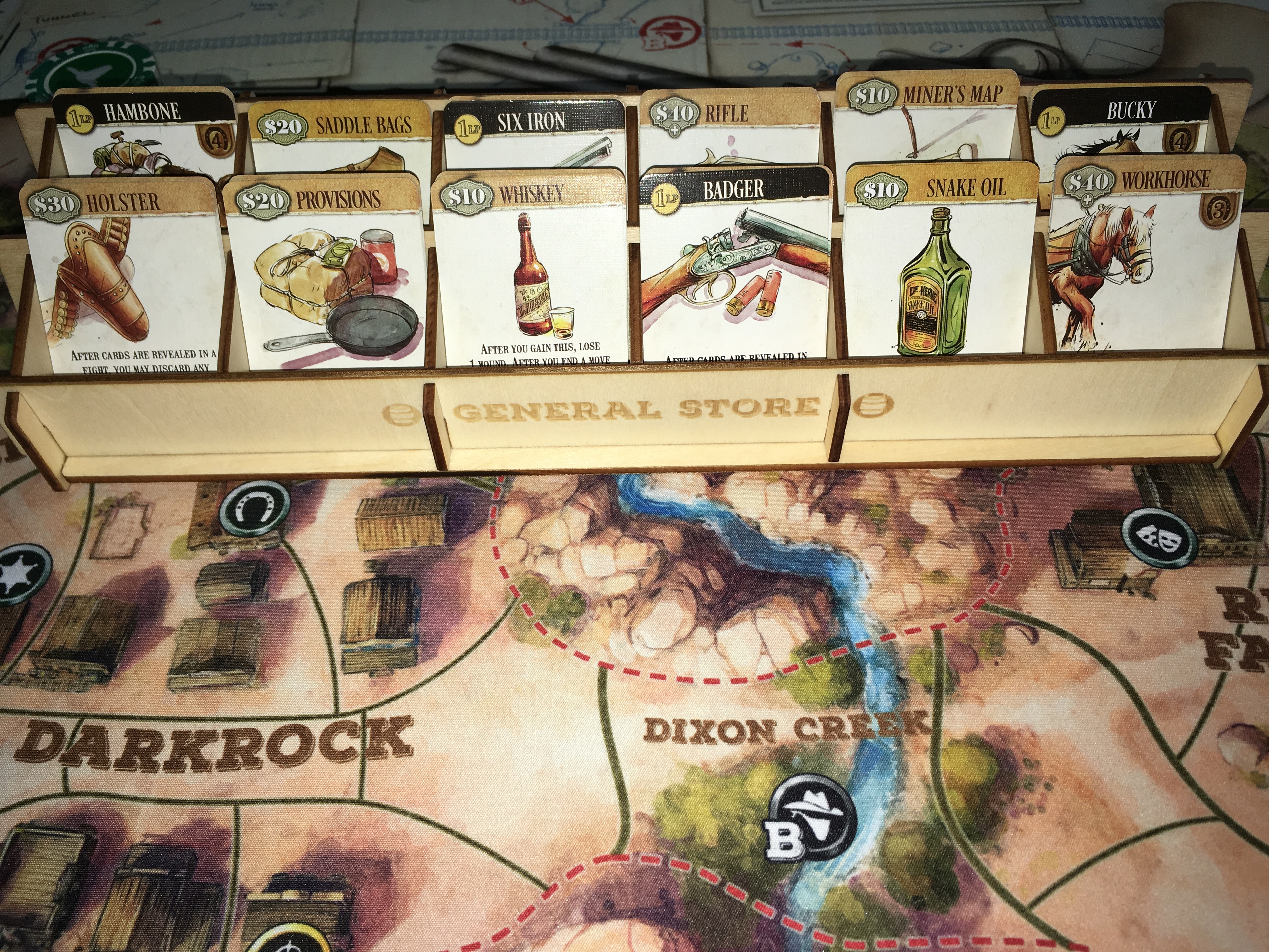 I set the game aside for a while, and before I knew it, there was a follow up expansion on Kickstarter…Ante Up. I had truly enjoyed my run through Western Legends, and couldn’t wait to see what amazing things Herve’ Lemaitre & Roland Macdonald would add to the game. The Kickstarter promised to deliver many of the things that had been on my wishlist…more characters (check), more territory to adventure in (check), and more items to buy (check)…PLUS they were bringing new gambling mechanics, a railroad experience, a new town, new sheriff features, more “Man In Black” variety, more scenario setups, and UPGRADES to the original components!!! After reading all that I was drooling! BRING IT ON KOLOSSAL GAMES!!!!